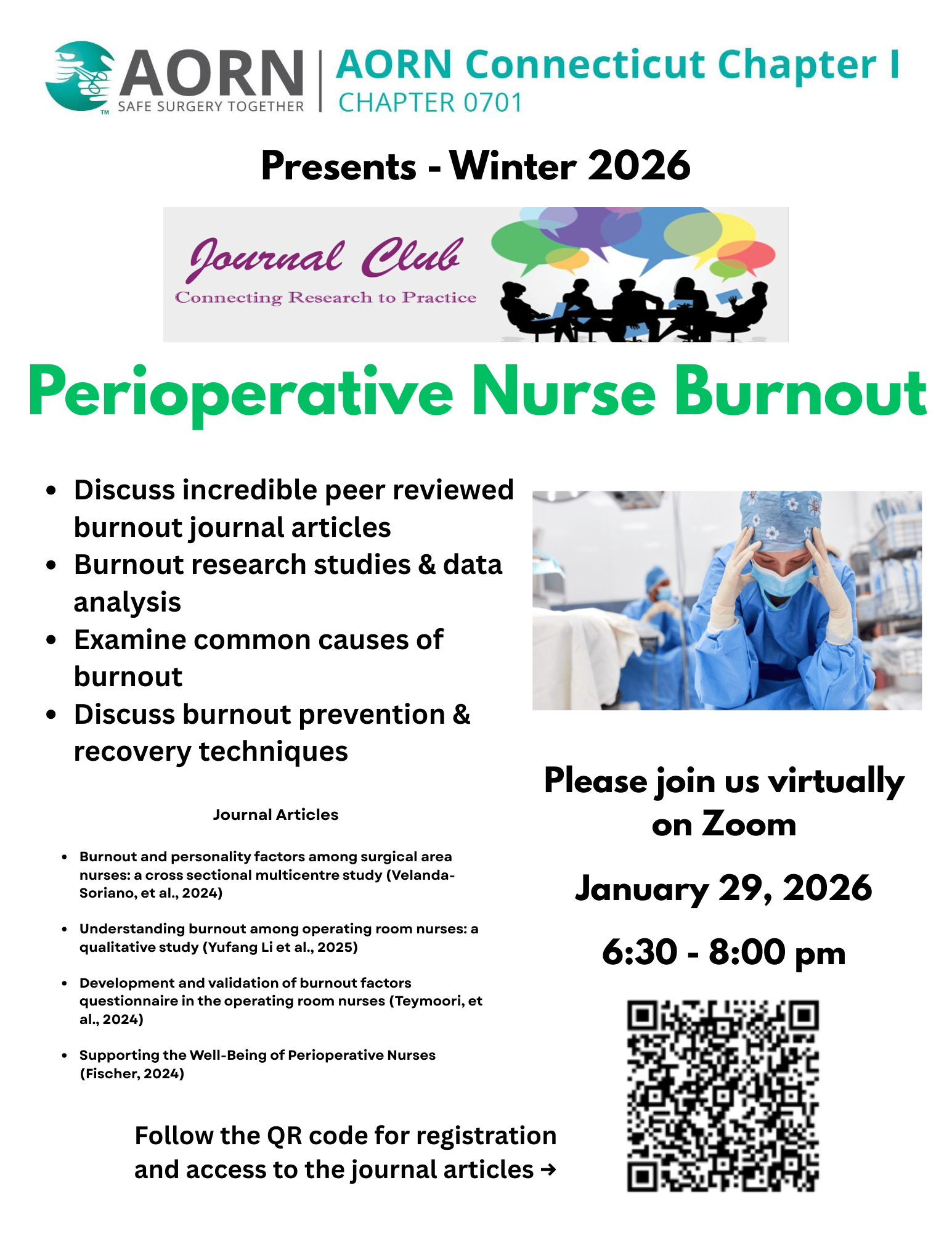 AORN CT Chapter 0701 is proud to present January 2026 Journal Club. This month we will be focusing on the very important topic of Perioperative Nursing Burnout. Through exploring several journal articles, we will discuss the factors that lead to burnout, how to identify and treat perioperative nurse burnout. We will engage in an open format discussion regarding the journals and deep dive into the topic and how and what we can do to support one another. Look forward to seeing you there!